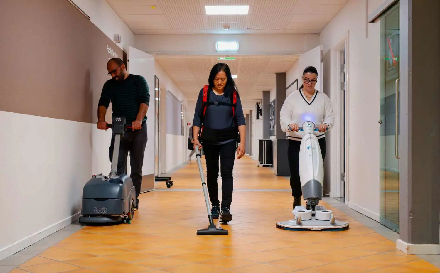 Fagbladet FOA har besøgt et af de hold af kursister, som dette efterår har gået på skolen og taget uddannelsen som rengøringstekniker. Kursisterne arbejder på både offentlige og private arbejdspladser, og ud over mødet med den nyeste teknologi lærte de også en masse om blandt andet ergonomi og rigtige arbejdsstillinger.