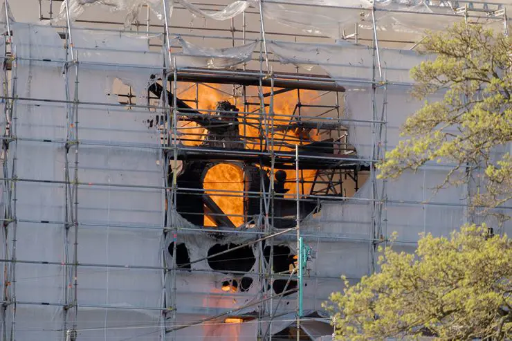 Det fortæller indsatsleder hos Hovedstadens Beredskab, Tim Ole Simonsen. ”Men alle kan jo se, at der er et stillads på bygningen, og at der har været håndværkere i gang, men det er selvfølgelig alt for tidligt at udtale sig om.” ”Det er vores umiddelbare opfattelse, at branden er startet oppe i den del af bygningen, hvor der har været noget arbejde i gang,” siger han til DR.