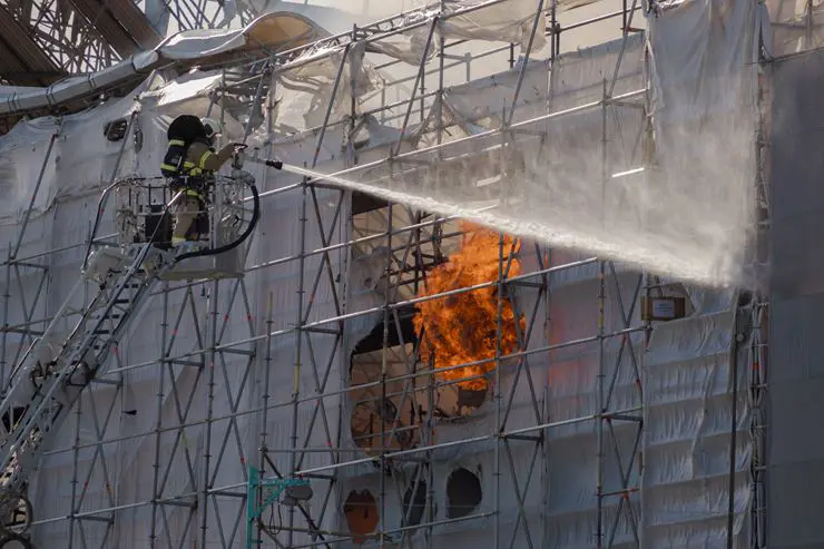”Børsen er samtidig pakket ind i stillads og presenninger, så det er også svært visuelt at se brandens udbredelse udefra. Det ser man typisk på facaden og gennem vinduerne,” siger han.