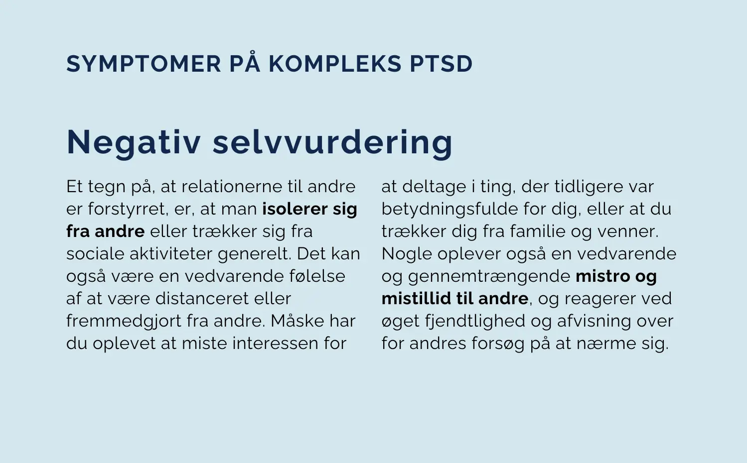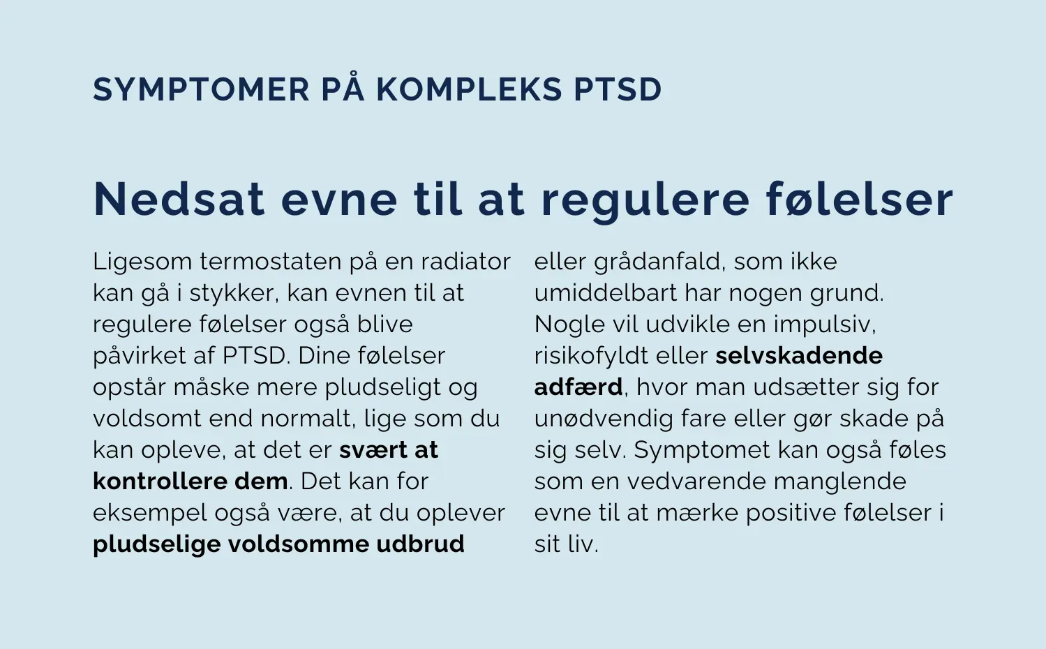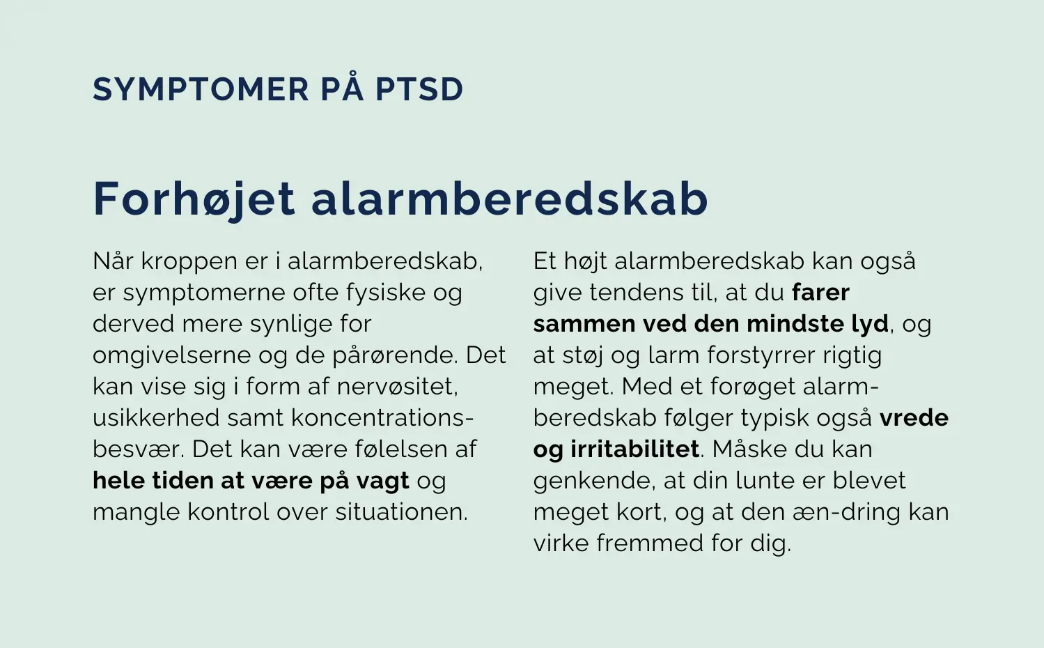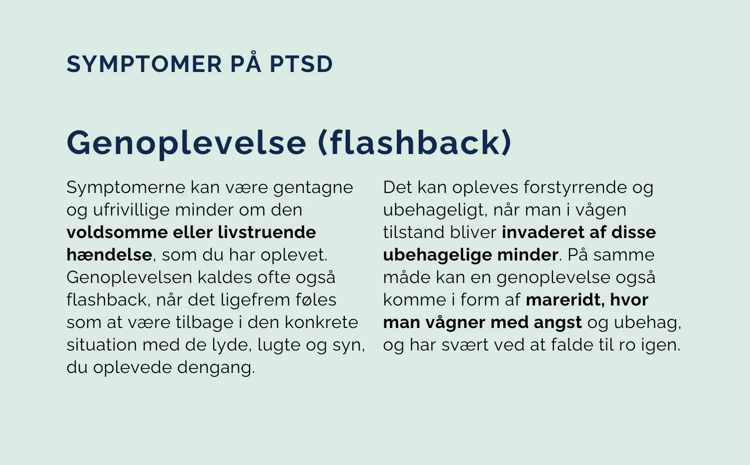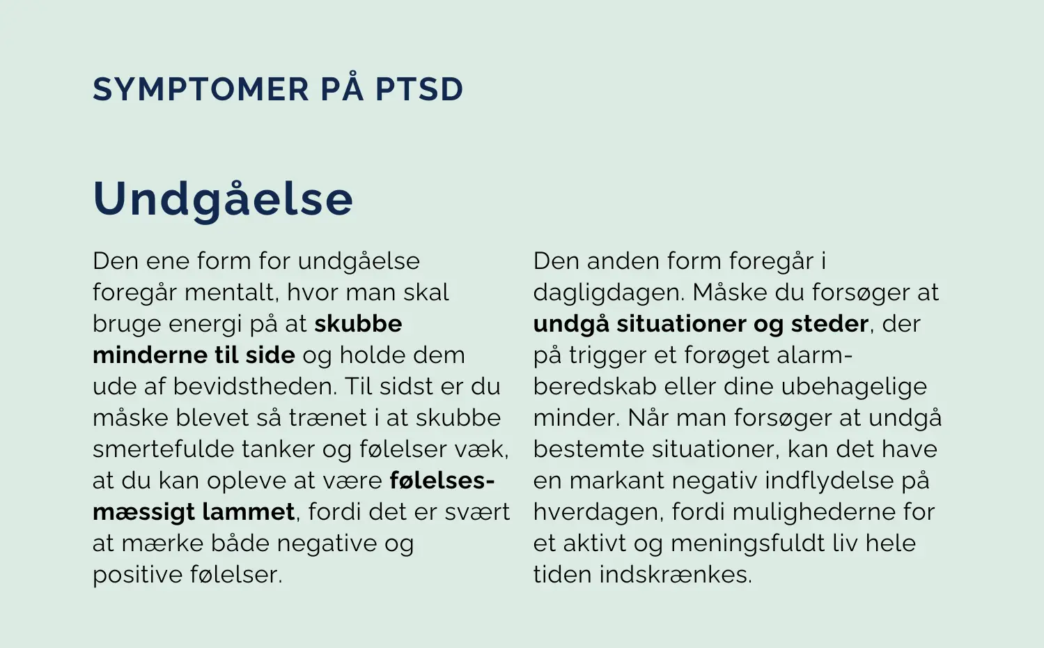- Opsøg viden om PTSD og lær dine symptomer at kende. På den måde opleves de gradvist mindre overvældende og farlige. Mind dig selv om, at tanker, følelser og minder kan være ubehagelige, men ikke er farlige.