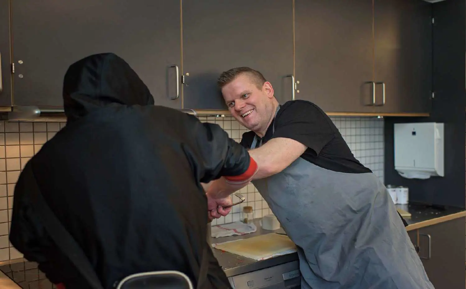 I dag har han hjulpet pædagog Adam Frost med at lave lasagne til fællesspisning. Beboere kommer drypvis forbi og tager en tallerken med lasagne med tilbage på deres værelse.