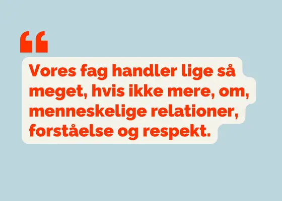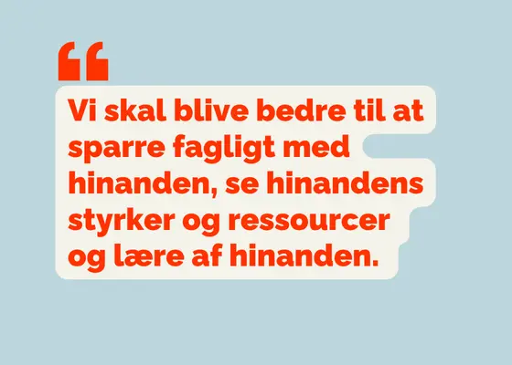 Derfor skal vi blive bedre til at sparre fagligt med hinanden, se hinandens styrker og ressourcer og lære af hinanden. Vi skal blive bedre til at erkende, hvor vi kan forbedre os og så faktisk forsøge at gøre det.
