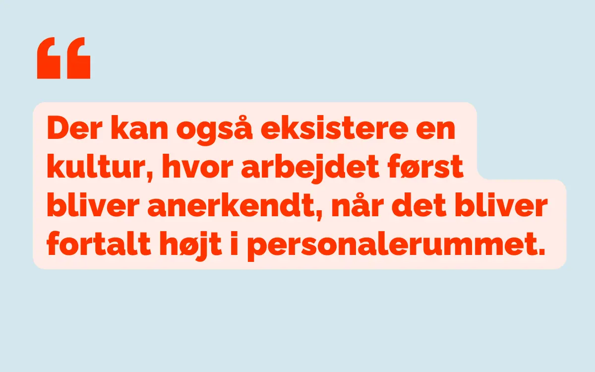 Der kan også eksistere en kultur, hvor arbejdet først bliver anerkendt, når det bliver fortalt højt i personalerummet. Der opstår en forventning om løbende at redegøre for, hvad man har lavet.