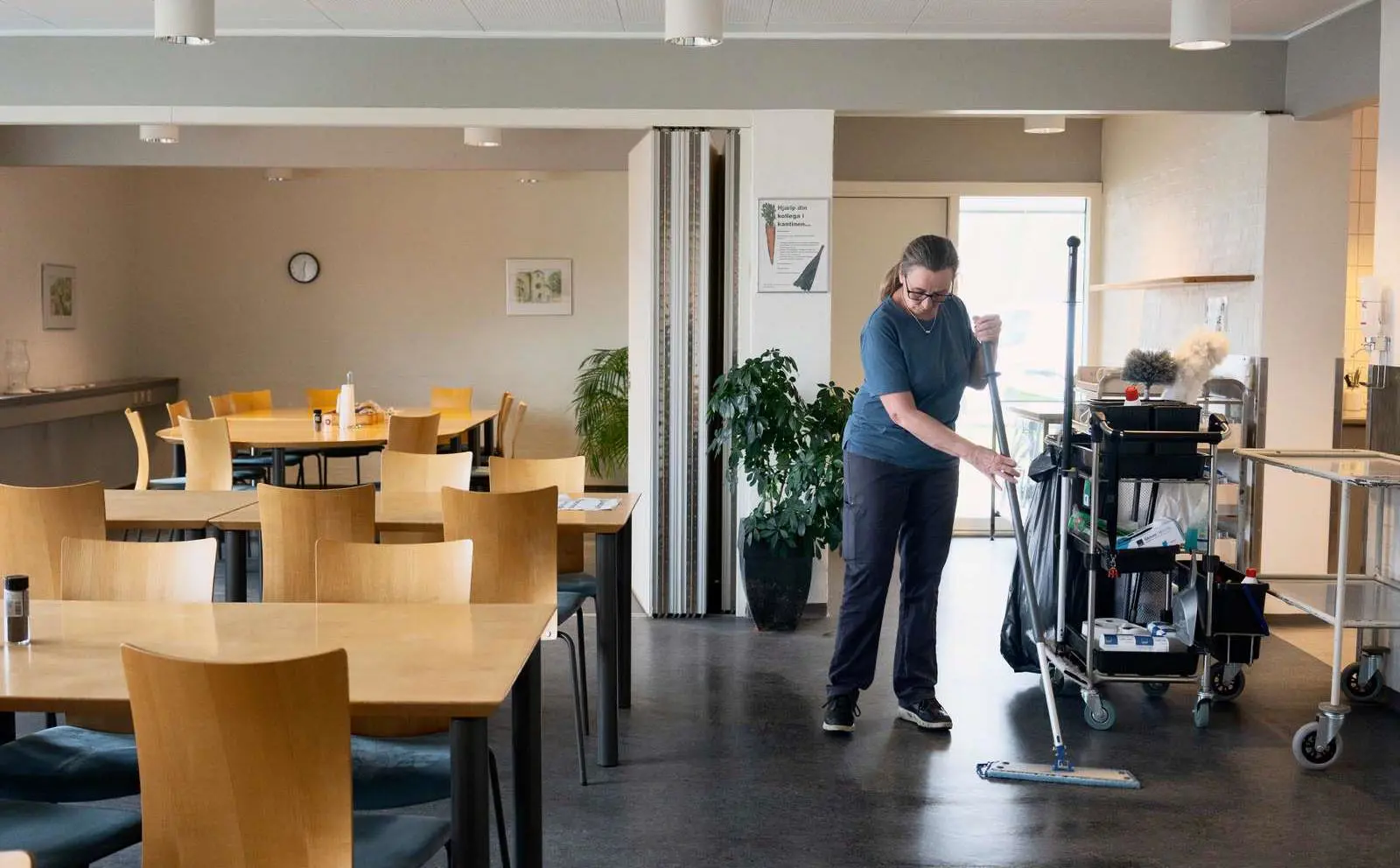Det er som regel klokken 13.20, at Lotte Skov svinger moppen og tager opvasken i kantinen i Storvorde. Det er Aalborg Kommunes bygning, der indeholder både bibliotek og hjemmesygepleje, og i dag er der afsat fem timer, så fra klokken 9 til klokken 14 gør Lotte Skov rent i lokalerne.