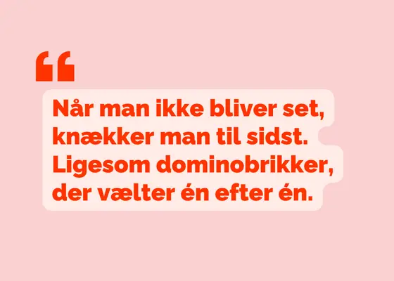 Hvor ildsjæle kæmper så hårdt imod, at de selv bliver syge – ikke på grund af kollegerne, men fordi ledelsen ikke ser, hvad der foregår. Og når man ikke bliver set, knækker man til sidst. Ligesom dominobrikker, der vælter én efter én.