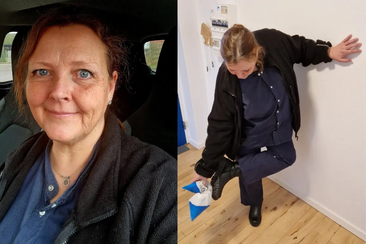 Susan Gliese Hallev balancerer på det ene ben, mens hun læner sig op ad en væg. Hun bøjer ryggen og med den ene hånd hvilende på væggen for at stabilisere sig selv, bruger hun den anden hånd til at trække en blå futte ned over sin ene sko.