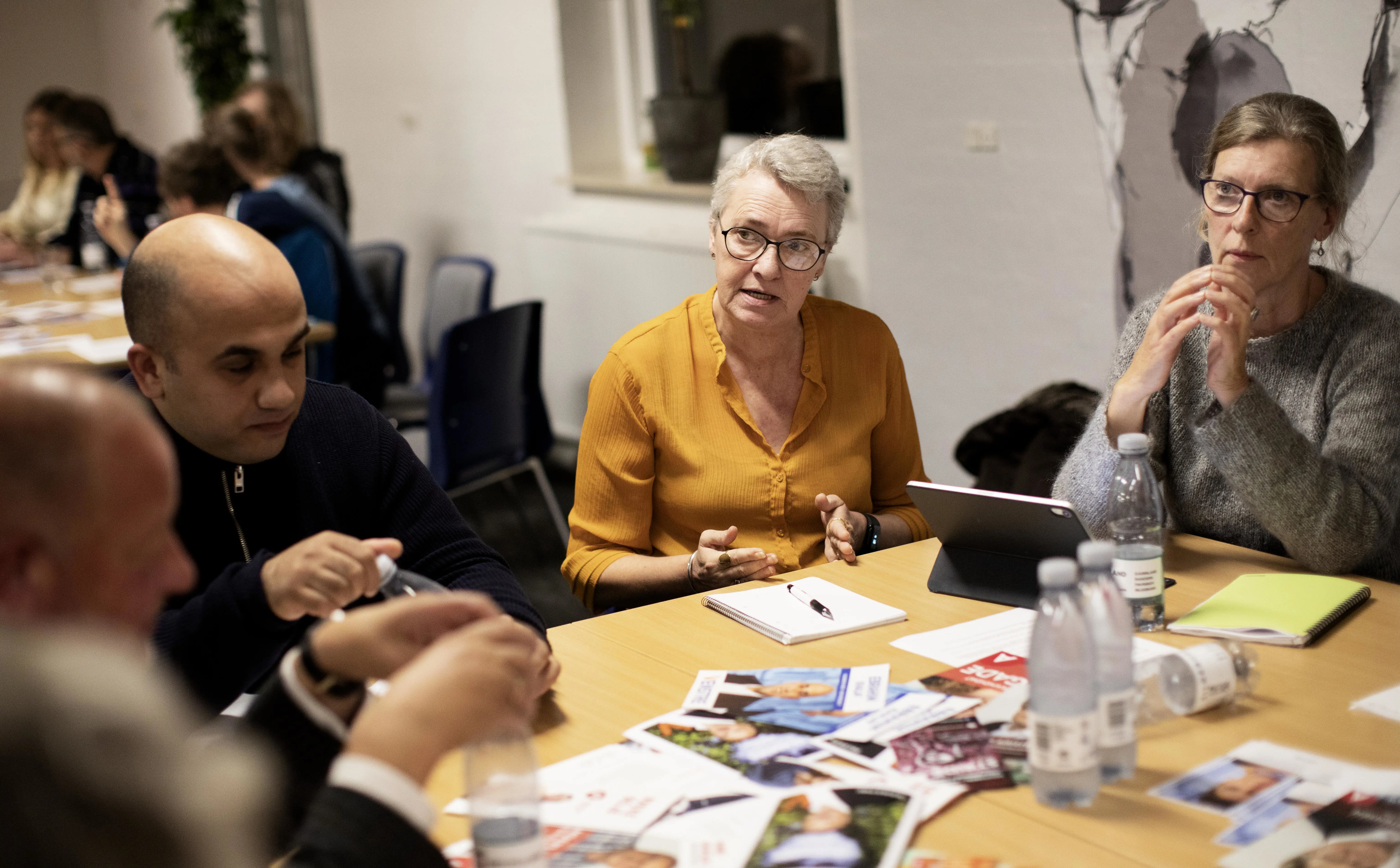 I salen er bordene opdelt efter velfærdsområde, og så kan byrådskandidaterne ellers fordele sig, som de har lyst. I løbet af aftenen kommer en håndfuld politikere forbi ’social- og sundheds’-bordet. Her sidder en overvægt af social- og sundhedsassistenter klar til at gøre kandidaterne klogere på en lang række udfordringer i ældreplejen.