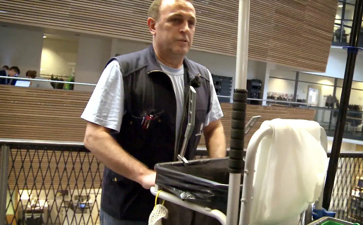 Grunden til, at han arbejder helt ned på sekunder, er, at tiden er udmålt efter, hvor lang tid det tager at gøre hvert lokale rent. Men det meget snævre tidrum skaber forvirring blandt de ansatte.