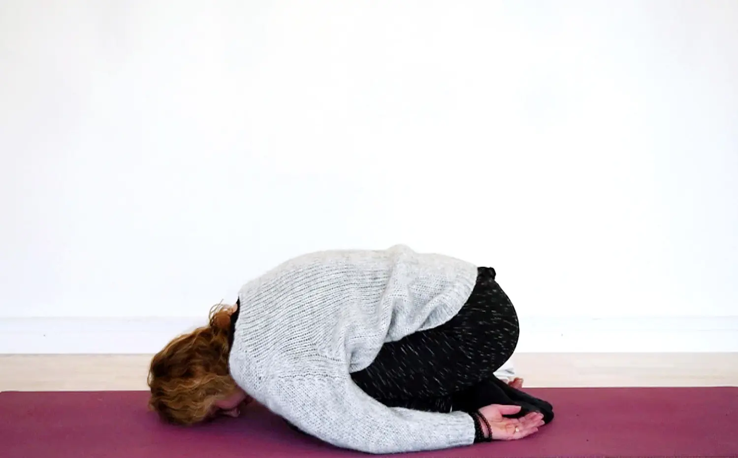 Sæt dig på knæ og læg dig herefter med maven hen over dine ben, med numsen mod dine hæle, panden i underlaget og armene ned langs siden. Slap af og få en fornemmelse af, at din vejrtrækning kører op og ned langs rygsøjlen. Øvelsen strækker din lænd og ryg.