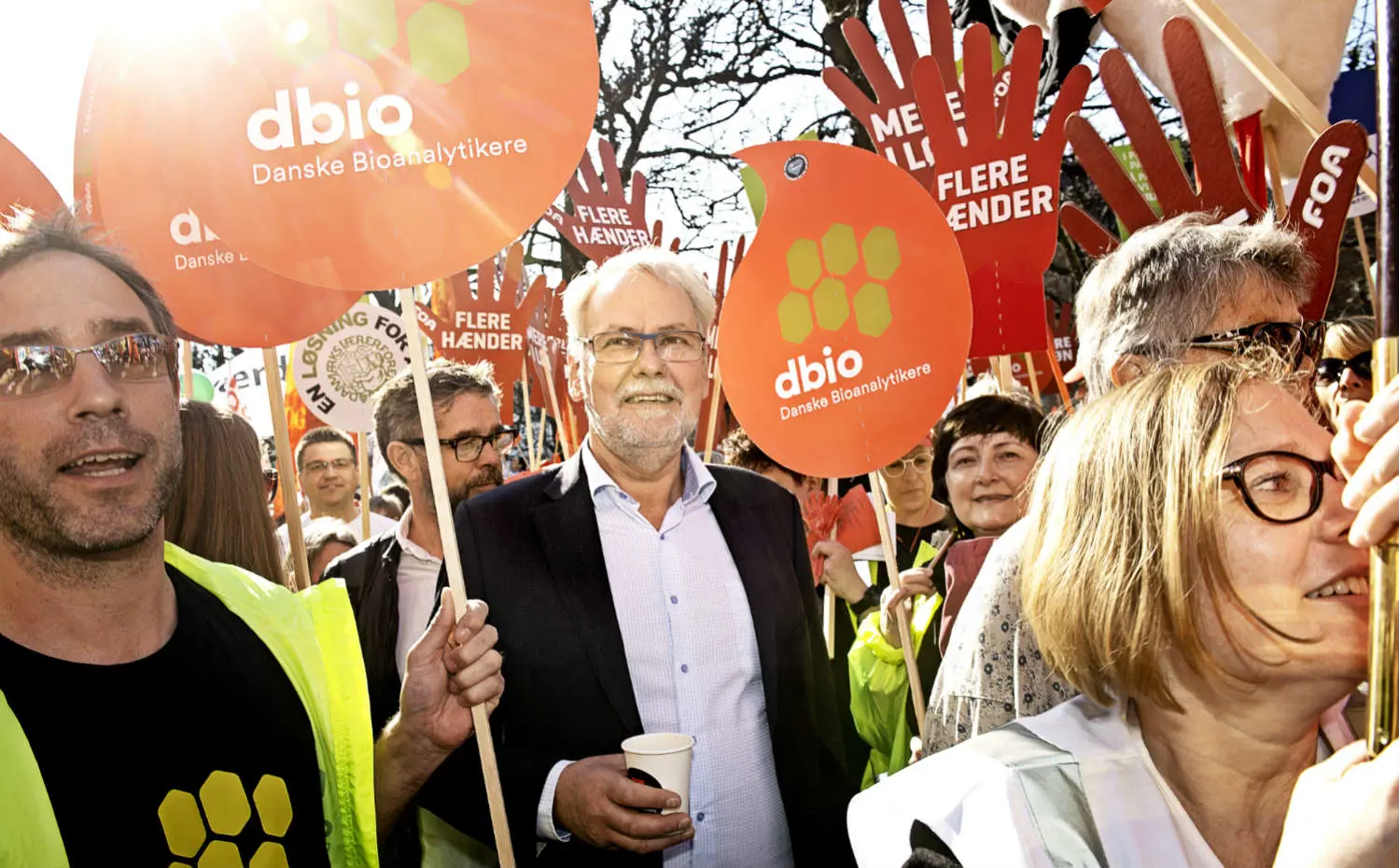 En hær af demonstranter med røde FOA-hænder, lyserøde BUPL-hatte, studenterhuer i pap, store skilte og skriggule refleksveste er i dag fredag stimlet sammen foran Forligsinstitutionen.