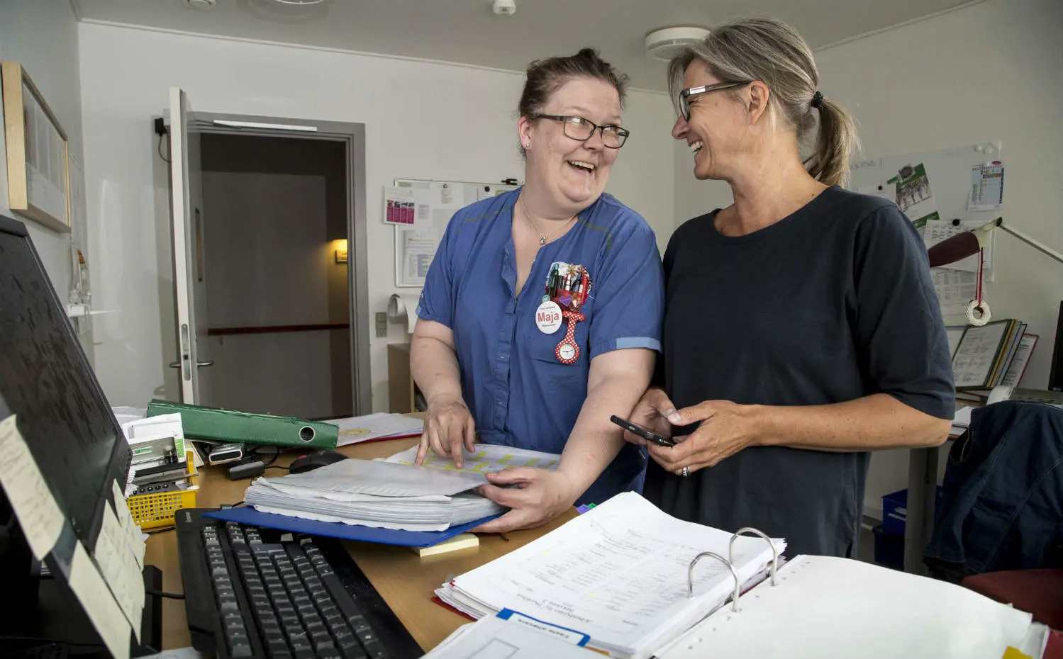 Gule post-it-sedler og små notater fylder ved vagtplanlægger Charlotte Søbyes kontorbord. De 25 faste kolleger på Plejecenter Thurøhus i Svendborg lægger beskeder til Charlotte om, hvornår de har behov for fri eller ændringer i vagtplanen.