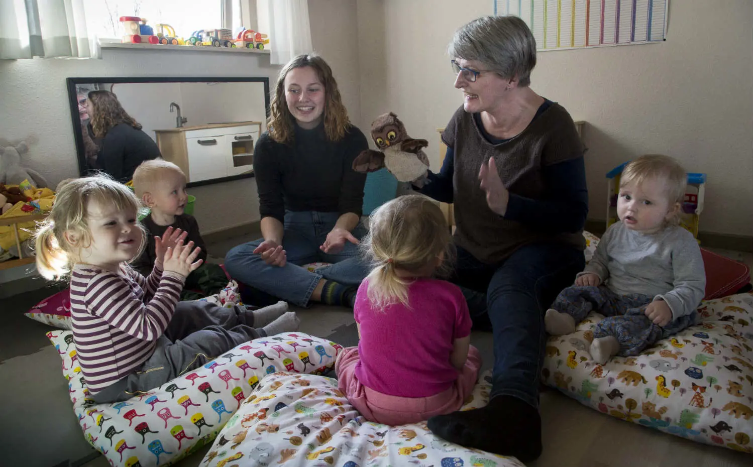 “Pude,” hviner Viktor på halvandet år begejstret, da dagplejer Gitte Olsen tager ‘sangpuderne’ frem og lægger dem på gulvet. Nu skal der synges. Og han ved præcis, hvordan det foregår.
