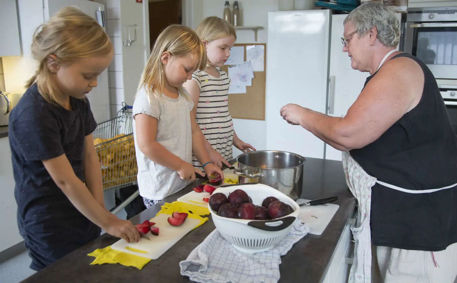 Ja da. De er helt pjattede med at være med til at lave marmelade. Og spise det bagefter. Og de er ekstra stolte, når de selv har haft en pose blommer med – eller har været med til at hente frugt i vores kolonihave. Børnene er altid velkomne i køkkenet, hvor der er et lille arbejdsbord til dem. De skal selvfølgelig vaske hænder, og vi overholder hygiejnereglerne. Men de kan sagtens skære frugt i stykker – den bliver jo kogt bagefter.