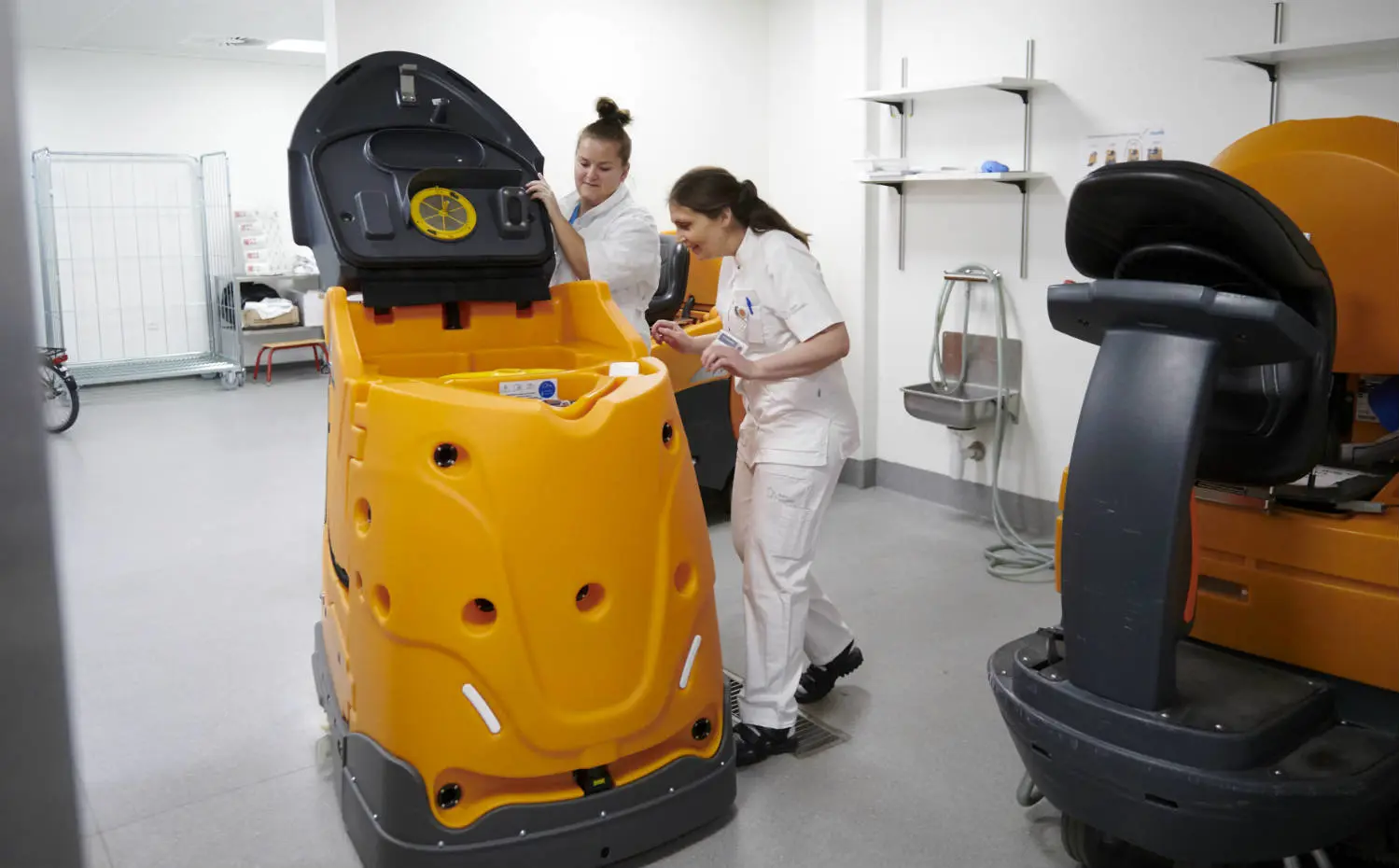 “Det kan være hårdt og rutinepræget at køre rundt på gulvvaskemaskinerne i flere timer,” siger hun. Kollegaen Jeanette Bendtsen er allerede oplært i at betjene robotten og synes, den er nem at have med at gøre.