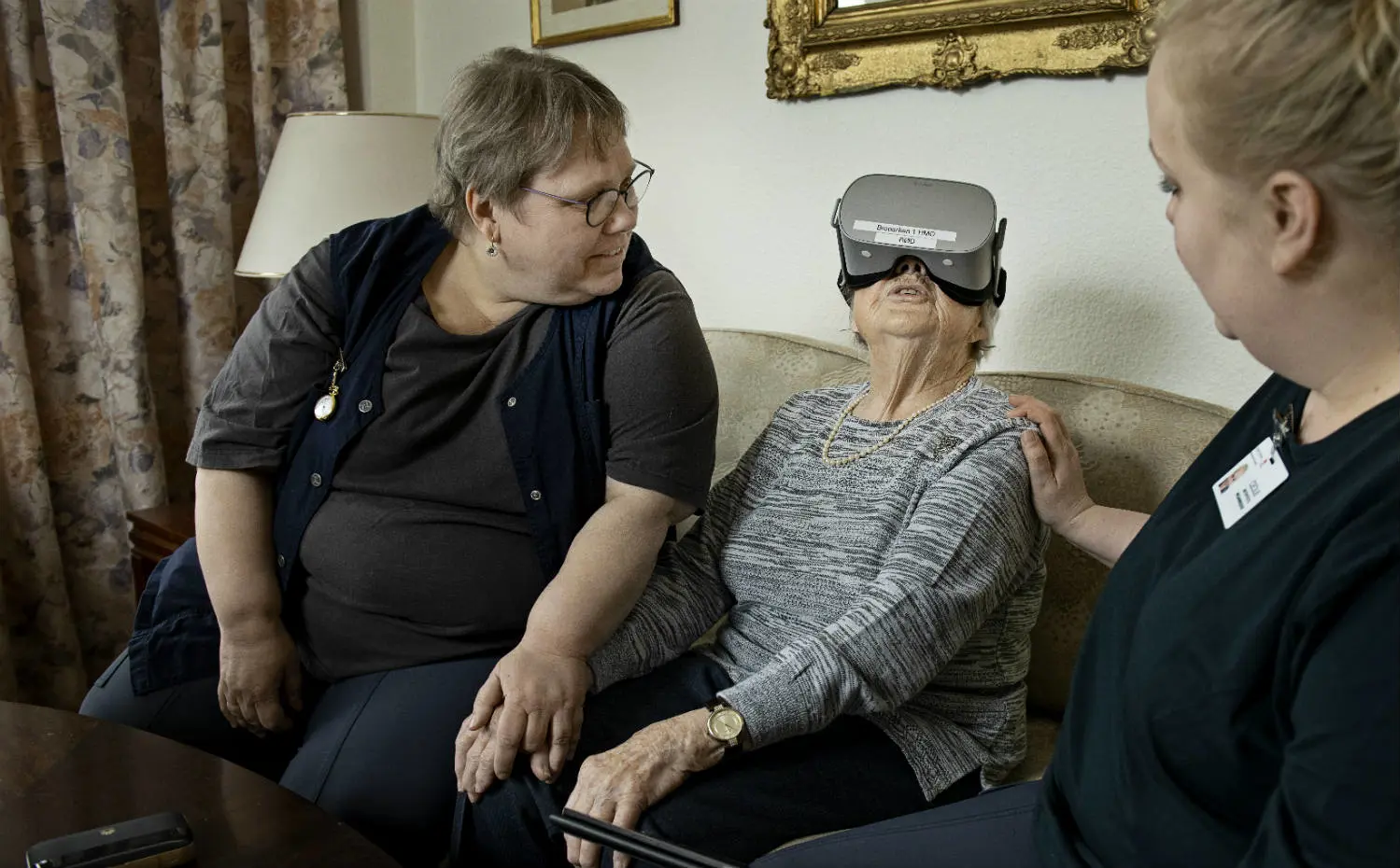 Men det ser hun ikke. Et par virtual reality-briller har nemlig tryllet hendes omgivelser om til en solskinsdag i den park, hvor hun så tit har gået tur. Ved siden af sig har hun aktivitetsmedarbejder Cecilie Nielsen, som følger med på en iPad.“Man kan aldrig bare placere brillerne på en beboer og så gå sin vej. En del af oplevelsen er, at vi taler om det, de ser,” siger Cecilie Nielsen.