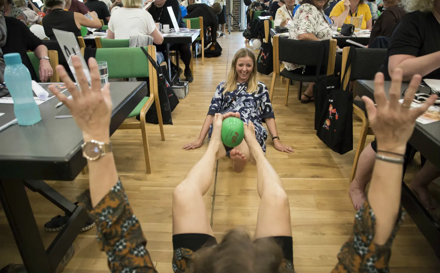 Til konferencen i Nyborg med omkring 430 dagplejere fra hele landet var der god mulighed for at øve sig i leg. Kit Nørgaard, som også er konsulent i leg og pædagogik, havde nemlig planlagt nogle øvelser, som skulle stimulere dagplejernes legende side.