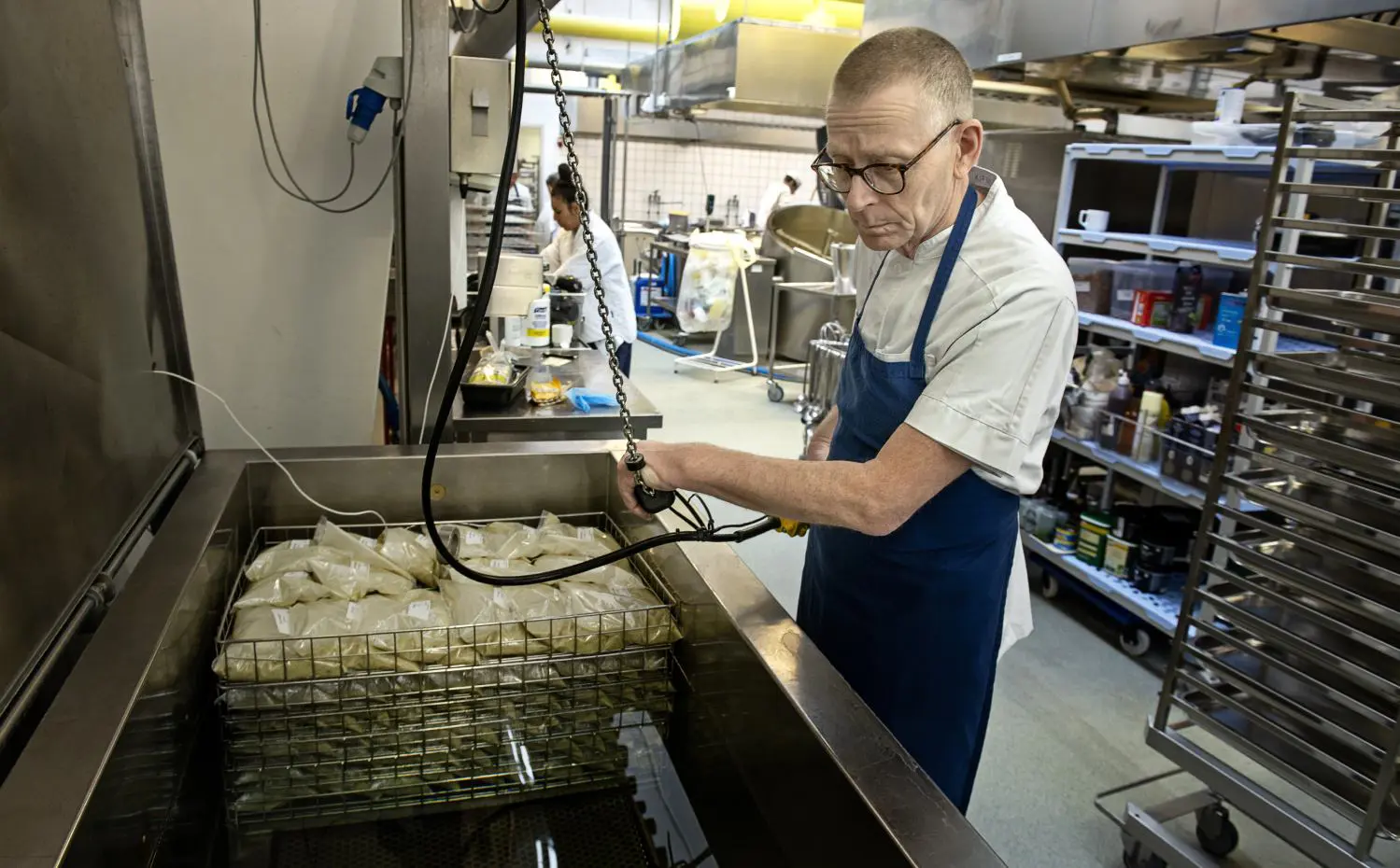 I køkkenet pumper Ib Suhr Olsen den 78 grader varme broccolisuppe over i en hot fill-maskine. Den fordeler suppen i plastikfilm, som den svejser sammen til poser. Derefter skal de hurtigt i et koldt vandbad, og så kan de holde sig i op til seks uger på køl. Og dermed kan køkkenet planlægge menuer de næste uger uden at smide Ibs gode suppe ud.