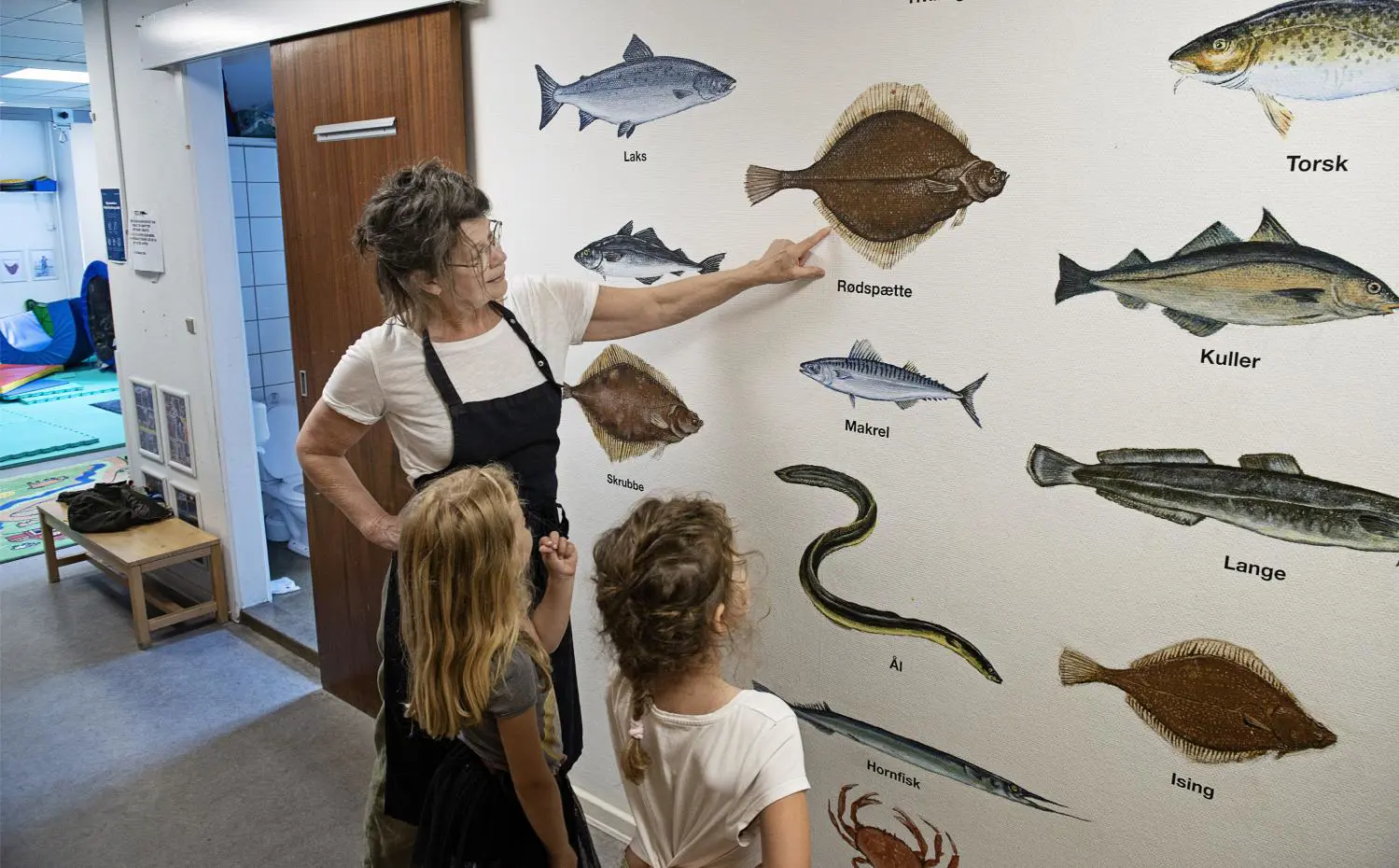 Blandt andet er en væg malet med forskellige spiselige fisk. Et andet sted er der anrettet en disk i børnehøjde med råvarer og dufteglas, og der er åbnet til køkkenskabene, så børnene selv kan tage service og være med til at dække bord.