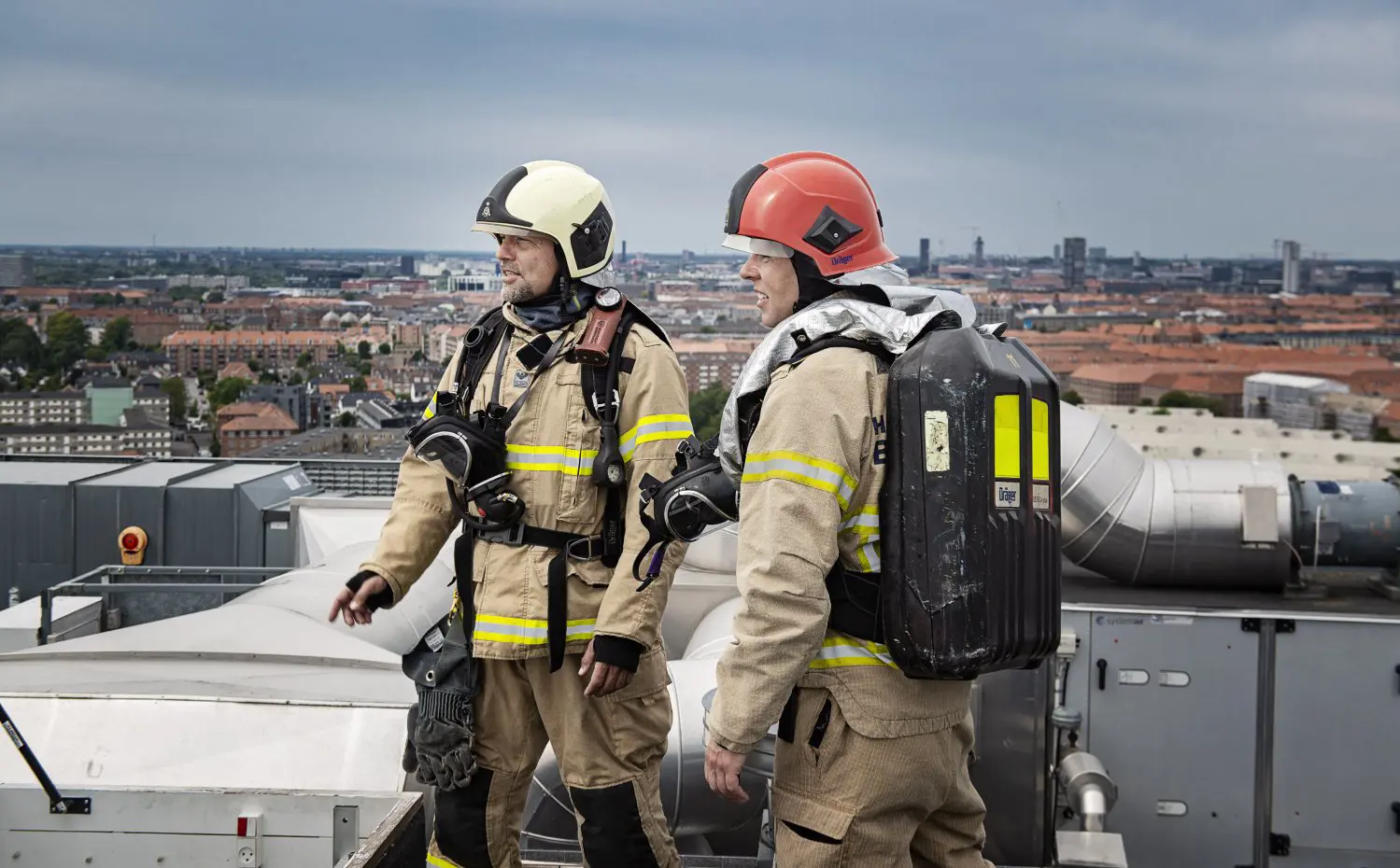 Med røgdykkerapparat, maske, hjelm, dragt og en slange over skulderen har de to brandmænd hver slæbt 45 ekstra kilo med sig op. Det er hårdt arbejde, der er drønvarmt, og der er ikke meget plads. Men brandfolkene er vant til værre forhold. Og de tager det med et smil.