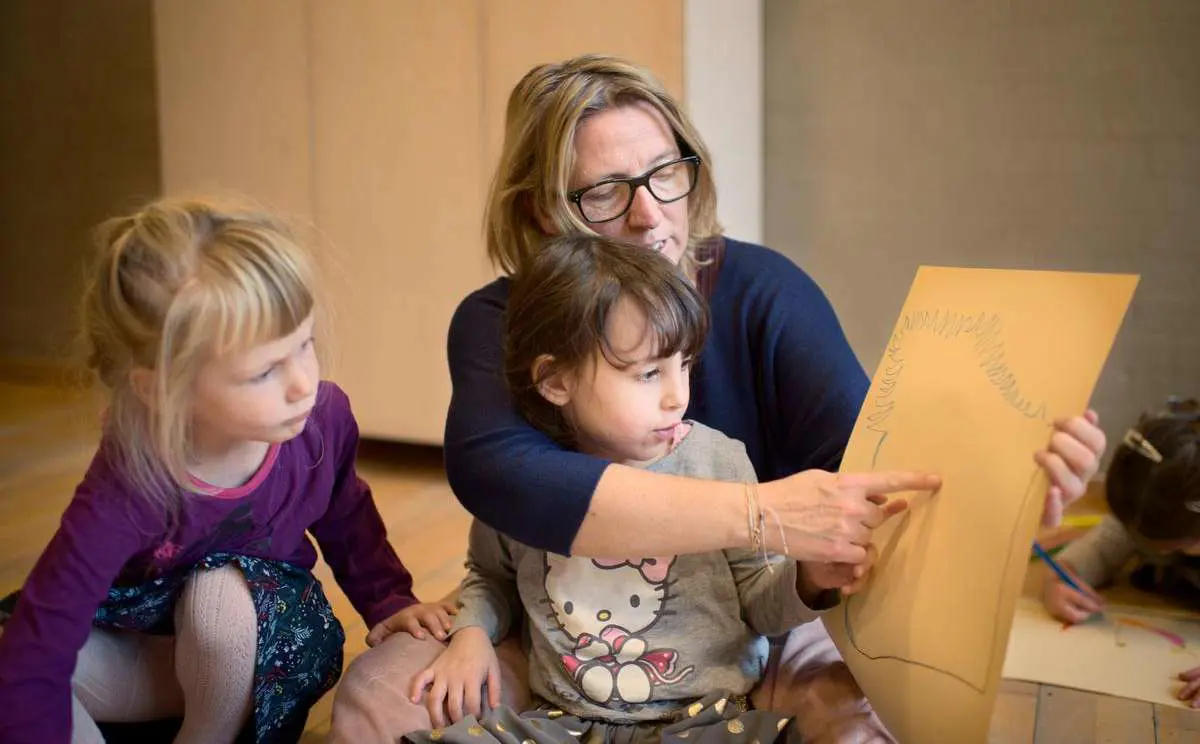 Men der er intet, der undgår hendes blik. Om det er Olga, der er gået i stå på sit papir, og ser ud som om hun har brug for at blive puffet videre. Om det er Atla, der får ondt i hånden og skal trøstes. Om det er Magne, der ikke synes, han er så god til at tegne som de andre og lige skal opmuntres, så gejsten lige så stille kommer tilbage.