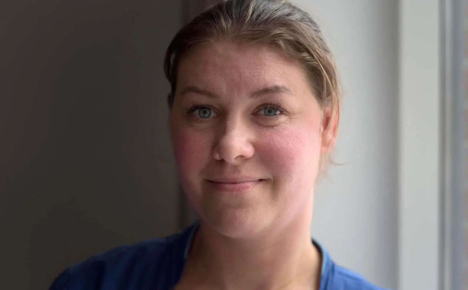 Michelle Egholm smiler, da hun træder ud af lokalet på plejecentret Rosengården i Hornslet, hvor hendes hjemmeplejedistrikt hører til.