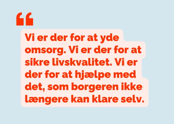 Vi er der for at yde omsorg. Vi er der for at sikre livskvalitet. Vi er der for at hjælpe med det, som borgeren ikke længere kan klare selv.