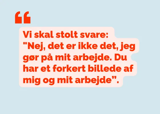 Vi skal stolt svare: "Nej, det er ikke det, jeg gør på mit arbejde. Du har et forkert billede af mig og mit arbejde. Men hvis du er nysgerrig på det, jeg arbejder med, så er jeg åben overfor at fortælle om alt det, du ikke ved om mit arbejde.”