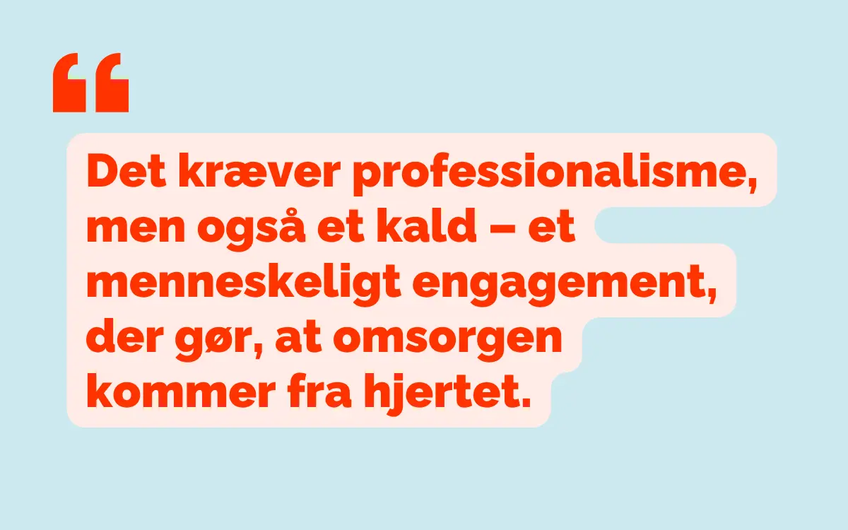 Hvis vi vil have de bedste medarbejdere i sundhed og omsorg, må vi også stå ved, at arbejdet kræver noget særligt af os. Det kræver professionalisme, men også et kald – et menneskeligt engagement, der gør, at omsorgen kommer fra hjertet.
