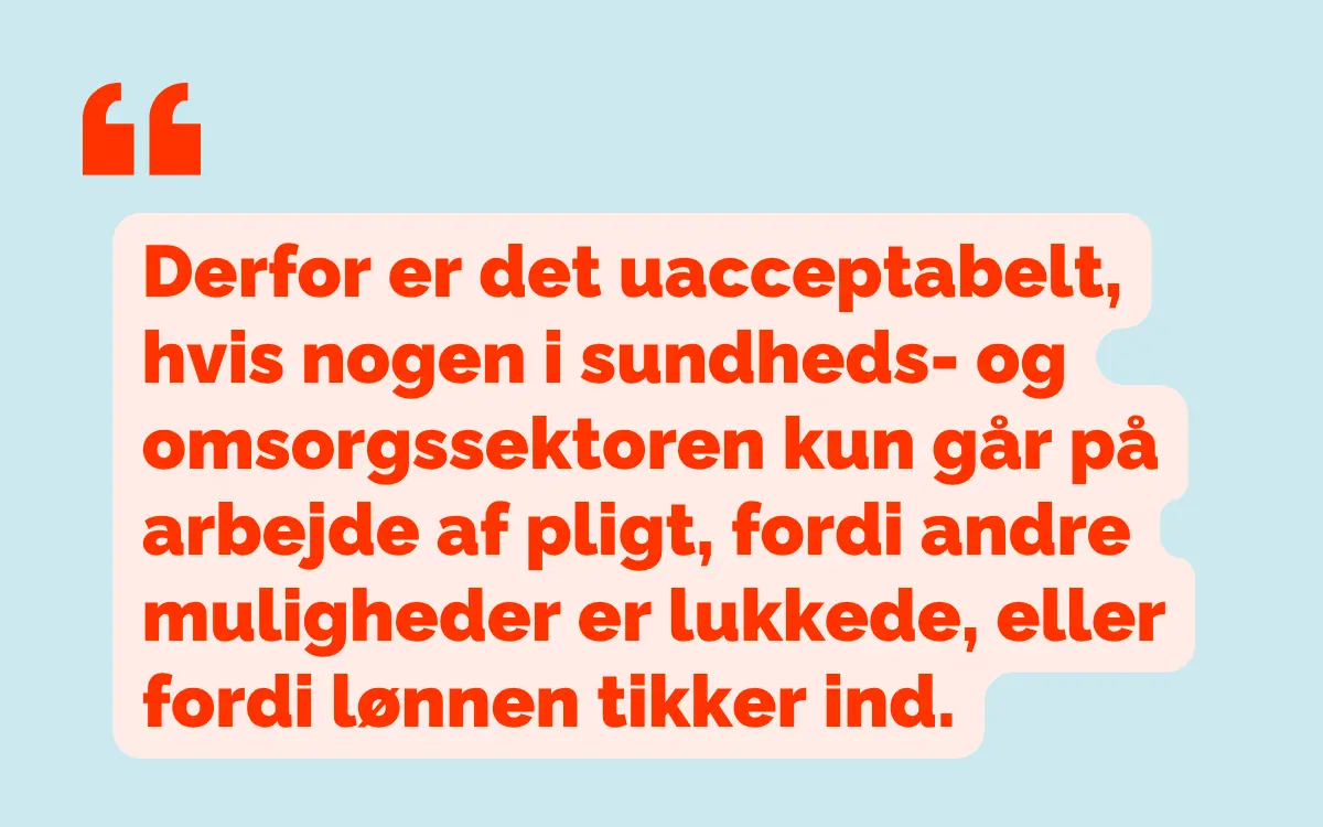 Derfor er det uacceptabelt, hvis nogen i sundheds- og omsorgssektoren kun går på arbejde af pligt, fordi andre muligheder er lukkede, eller fordi lønnen tikker ind. Den, der ligger ned, mærker det straks – og mærker, at omsorgen mangler.