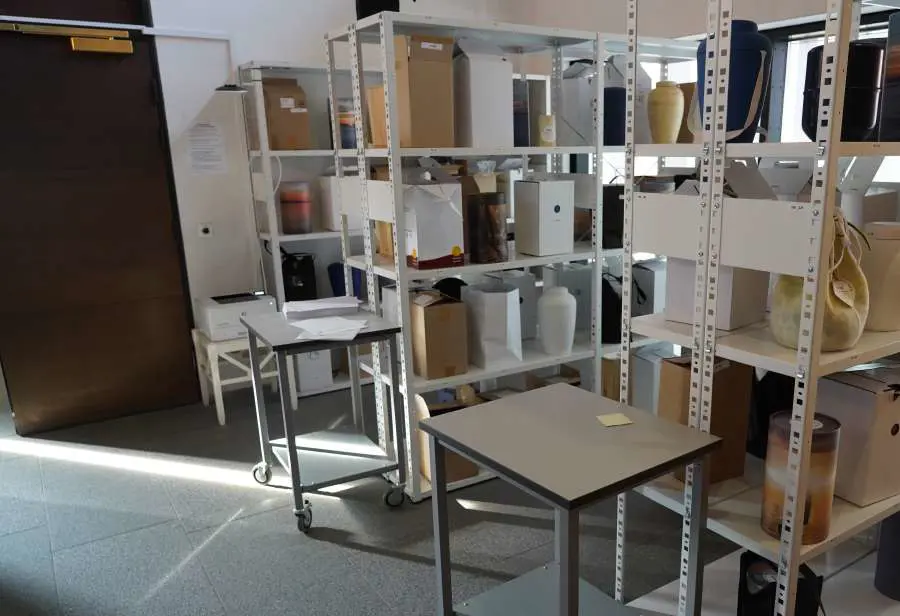 Længere nede ad gangen ligger urnelageret, hvor urner i keramik, filt, terrakotta, pap og træ står side om side.