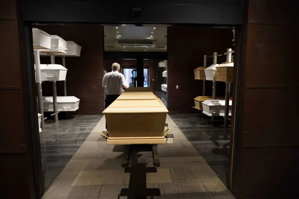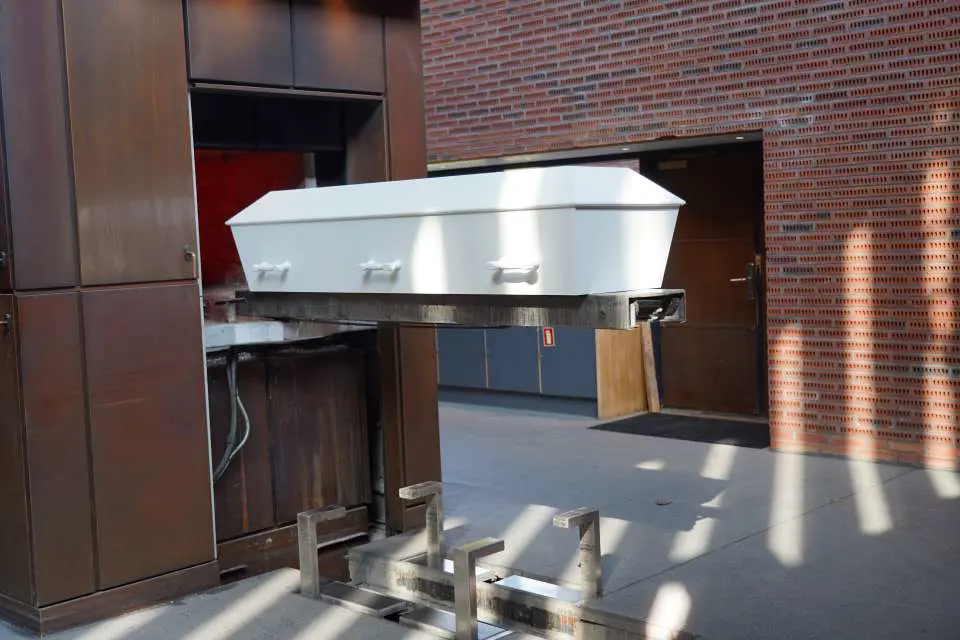 Nogle af kisterne venter på at komme ind til en højtidelighed, andre på at blive kremeret.