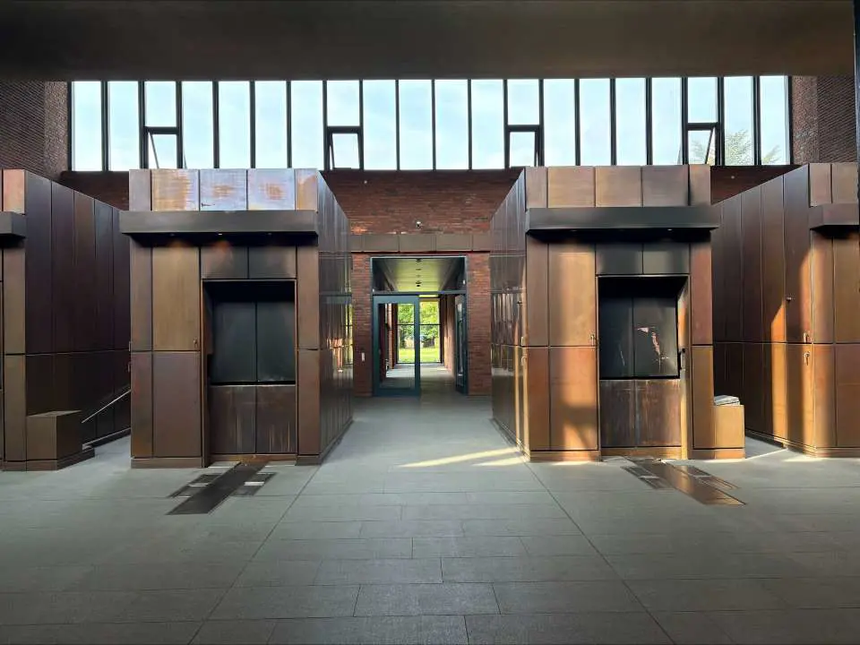 Bagerst i bygningen står de fire kobberbeklædte krematorieovne, som funkler orange i sollys fra ovenlysvinduerne.