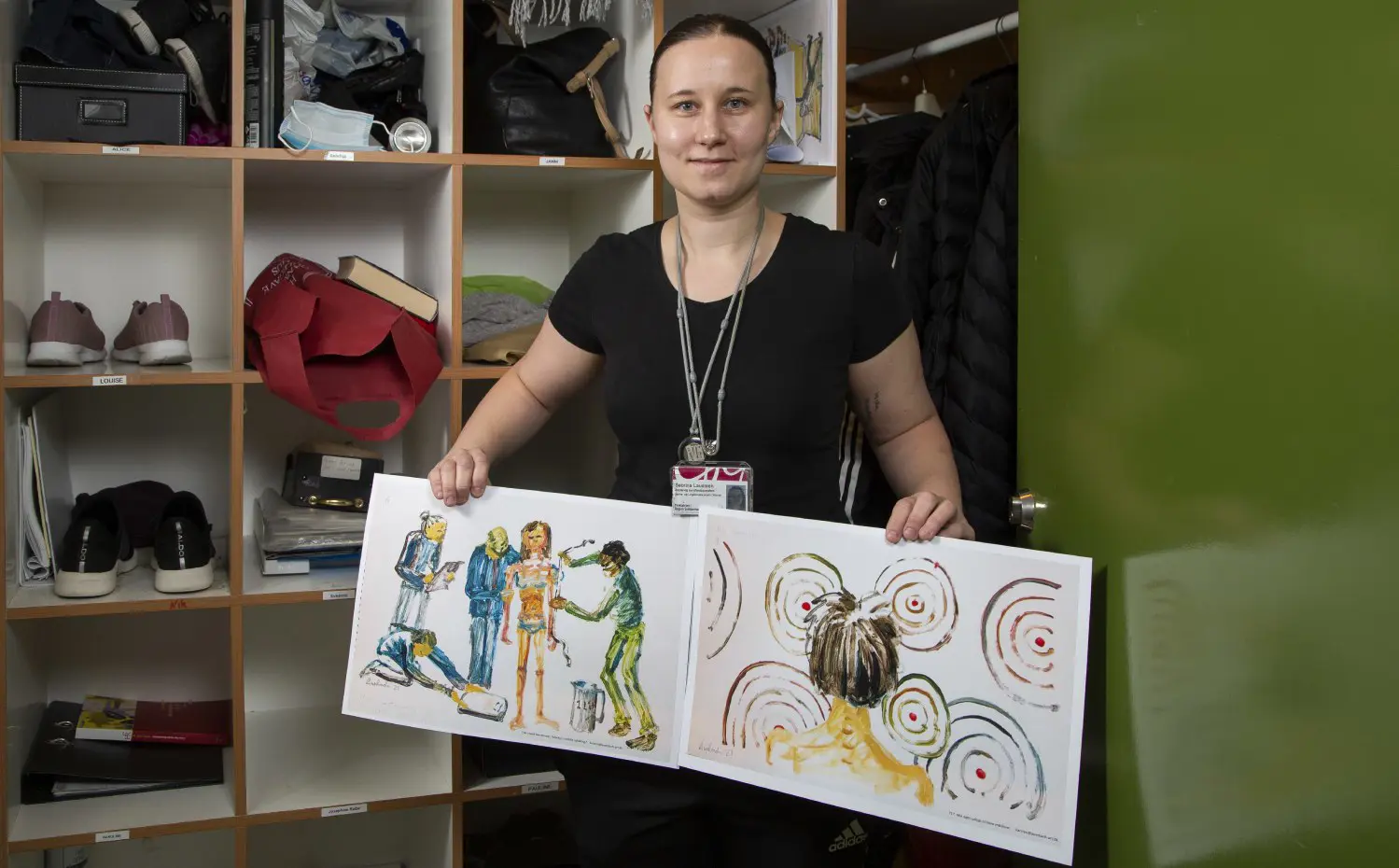 En kunstners skitsetegninger fra patientkonferencer og personalemøder på børne- og ungepsykiatrisk afdeling skærper de ansatte: ”Jeg kommer ind i hovedet på patienterne,” siger social- og sundhedsassistent Sebrina Laustsen.