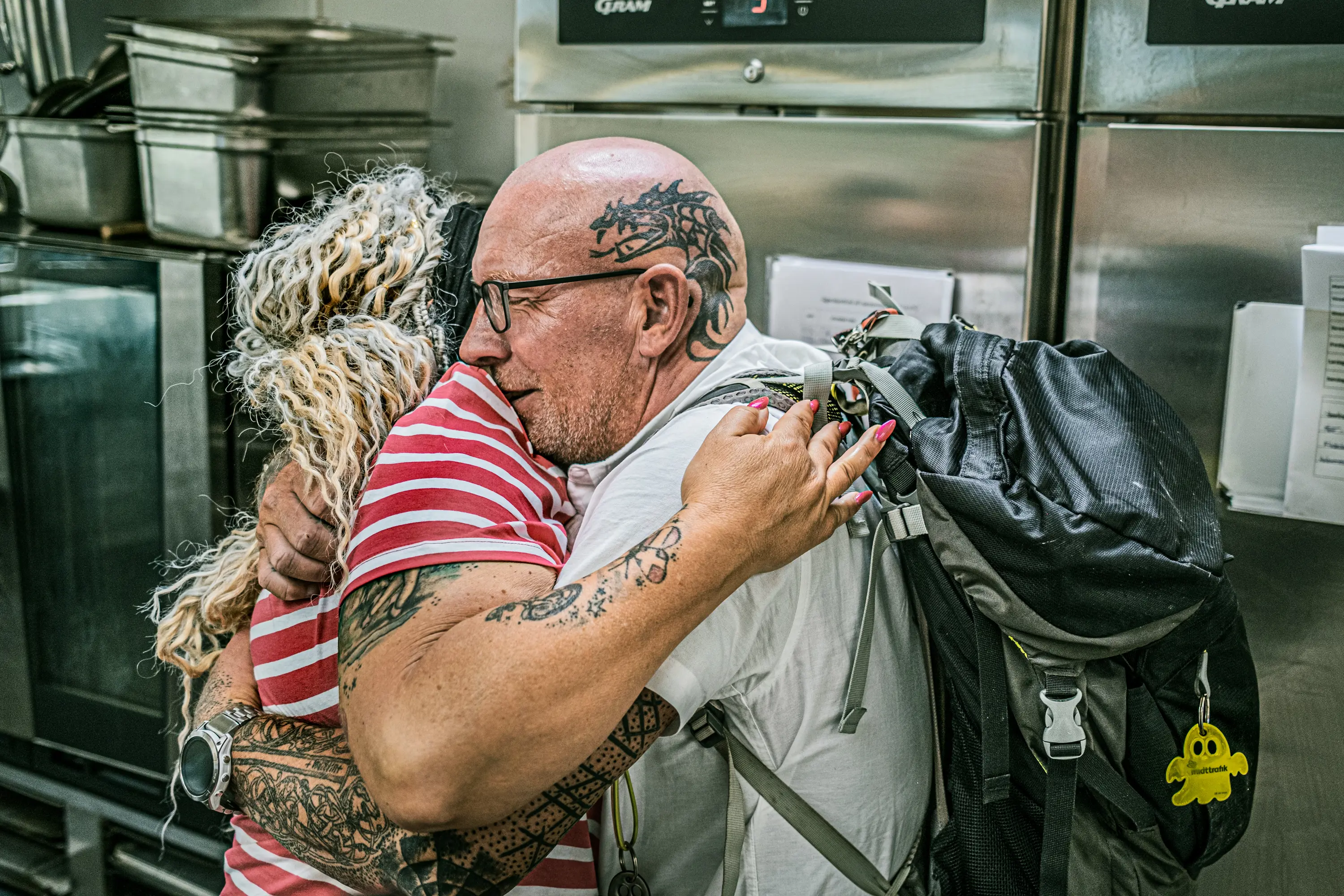 En bruger med tatoveringer på issen og på armene har brug for en snak. Han fortæller, hvordan han har det, hvordan det går. Han får et stort kram, inden han forlader Værestedet.