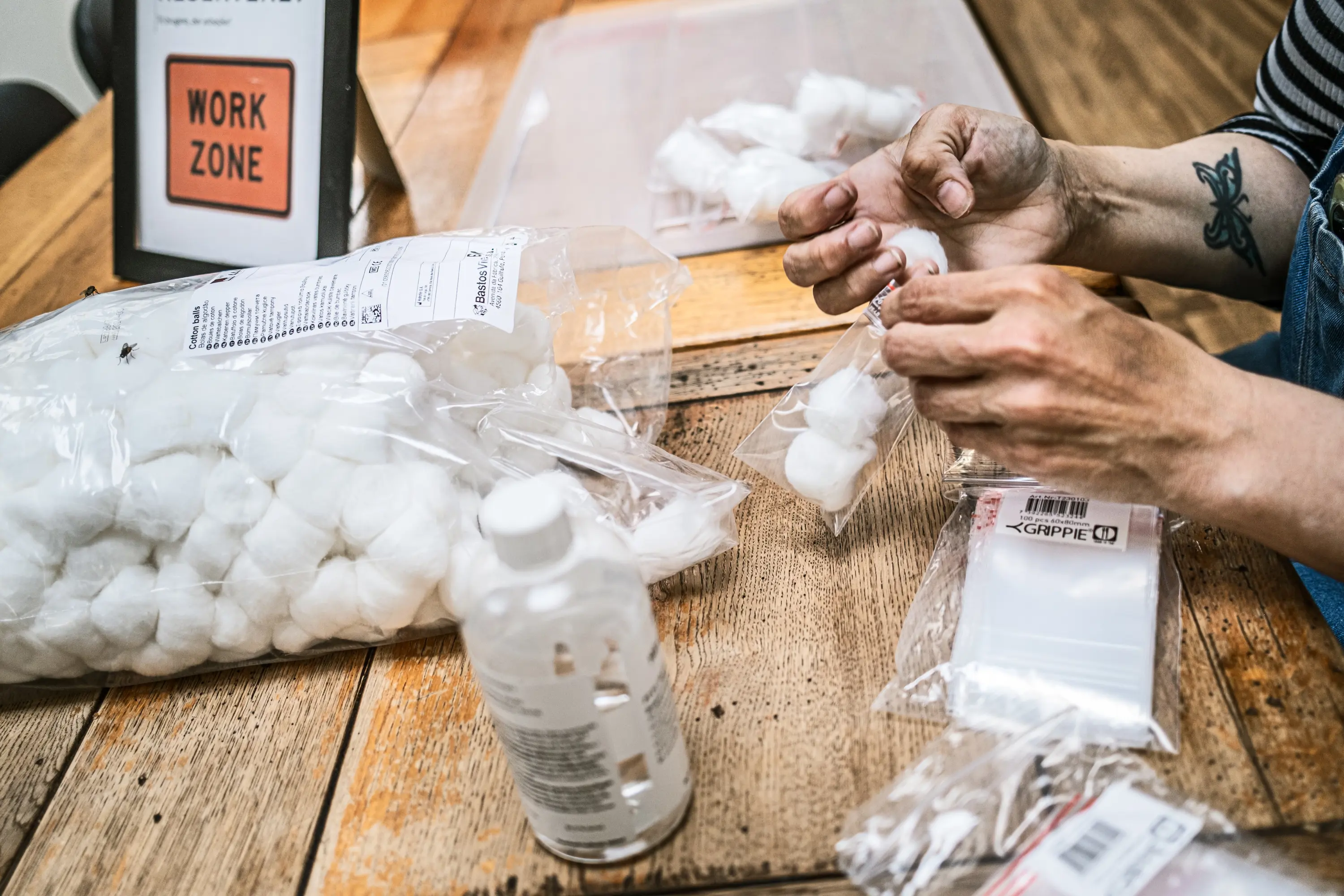En kvinde får to timers arbejde ved at fordele en pose små vatpuder med tre i hver i små poser. Poserne bliver udleveret sammen med engangsværktøj til narkomaner.