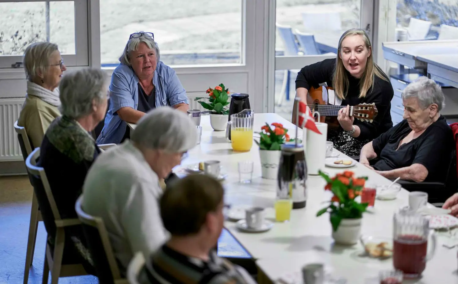 I kaffestuen fortsætter fællessangen, og man har nu kastet sig ud i klassikeren ‘Alle sømænd er glade for piger’. Det kniber dog med at huske teksten for både personalet og beboerne, men det er der råd for. “Vi tager bare et tralala-vers,” råber Birgitte Bjørn, og sådan bliver sangen afsluttet.