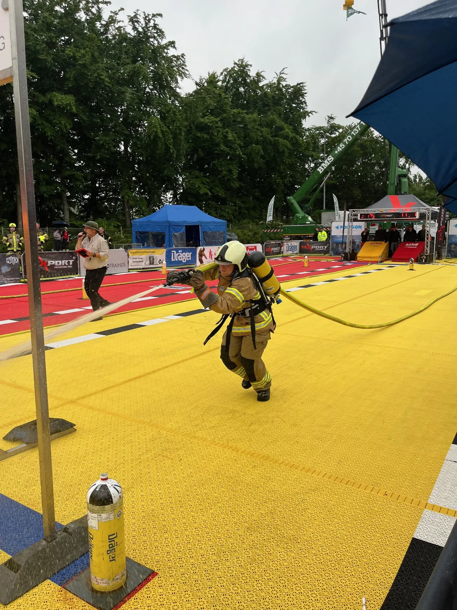 - Så løbes der slalom over den 45 meter lange bane, og i den modsatte ende samles en fyldt brandslange op, som skal med tilbage og bruges til at ramme et bål med strålen.