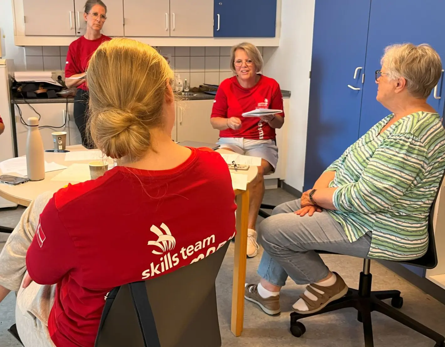 11.00: Kaja Lorenzen får feedback på sin præstation i øvelseslokalet af de lokale SOSU Syd-trænere Heidi Bockmann og Tina Enghave, samt den danske sosuskills-landstræner Lotte Schulz.