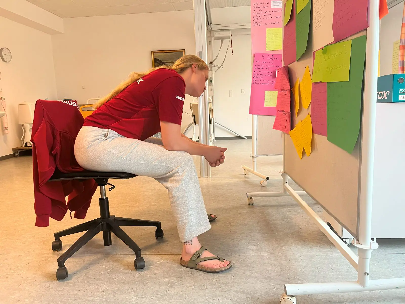 8.15: Kaja Lorenzen møder ind på SOSU Syd sammen med træner Heidi Bockmann. De gennemgår kort dagens program.