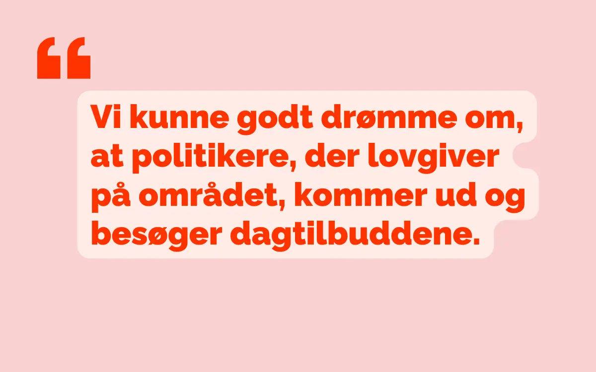 Vi kunne godt drømme om, at politikere, der lovgiver på området, kommer ud og besøger dagtilbuddene. At de trækker i arbejdstøjet – noget der godt kan tåle at blive beskidt – og tilbringer en dag, hvor alle de pointer, de ofte hører råbt op om, bliver erfaret gennem egne øjne.