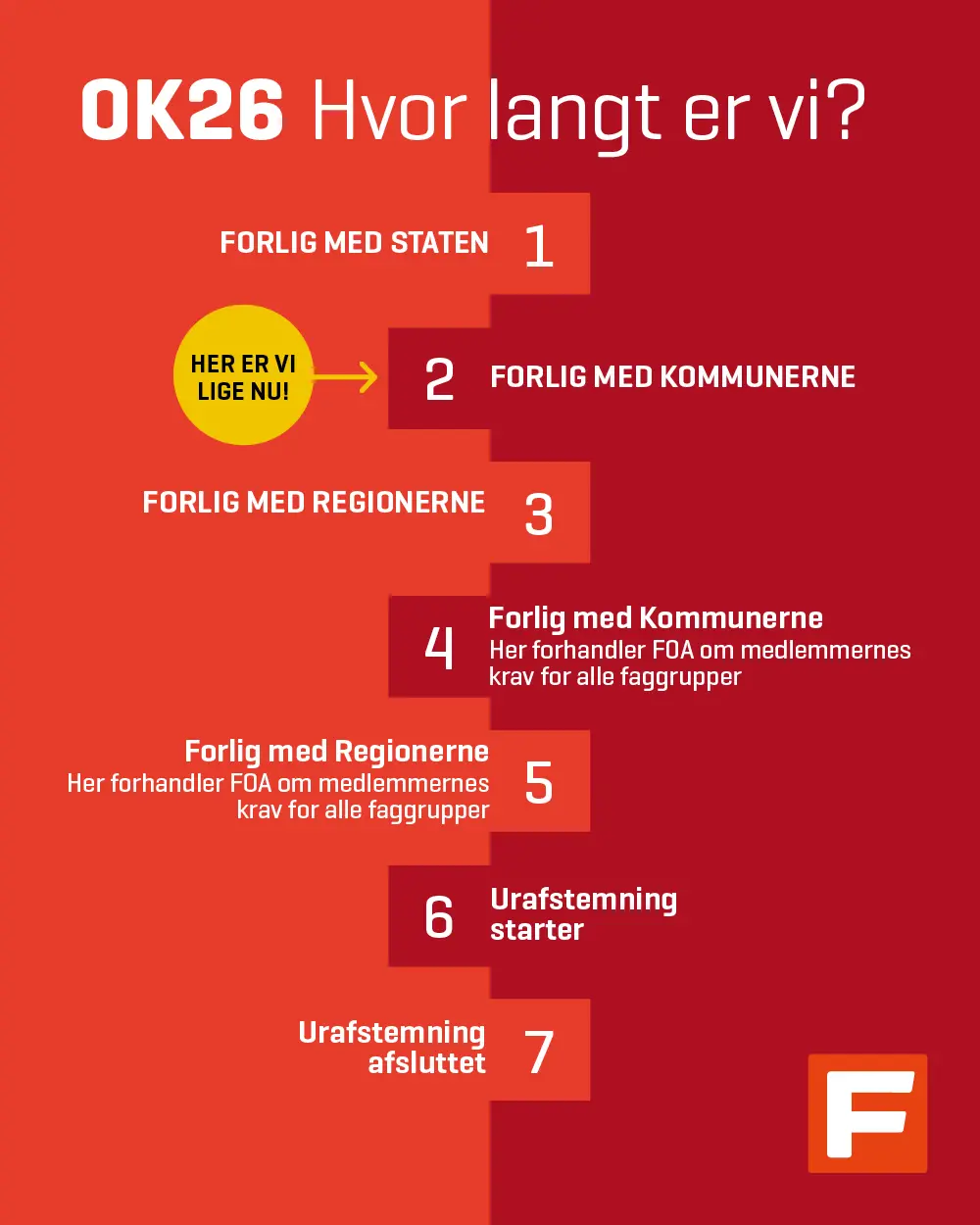 Her kan du se, hvor langt vi er kommet i overenskomstforhandlinger, som strækker sig lige fra forhandlinger med staten til FOAs egne forhandlingerne med arbejdsgiverne.