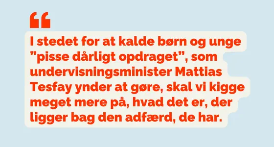 I stedet for at kalde børn og unge ”pisse dårligt opdraget”, som undervisningsminister Mattias Tesfay ynder at gøre det, skal vi kigge på, hvad det er, der ligger bag den adfærd, de har.