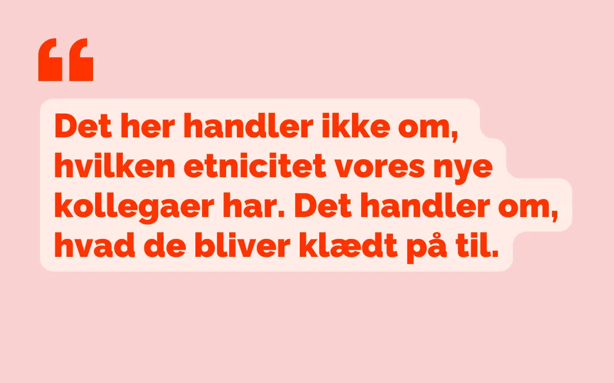 Det her handler ikke om, hvilken etnicitet vores nye kollegaer har. Det handler om, hvad de bliver klædt på til. Jeg har også kollegaer med andre nationaliteter end dansk nu – gode og søde kollegaer.