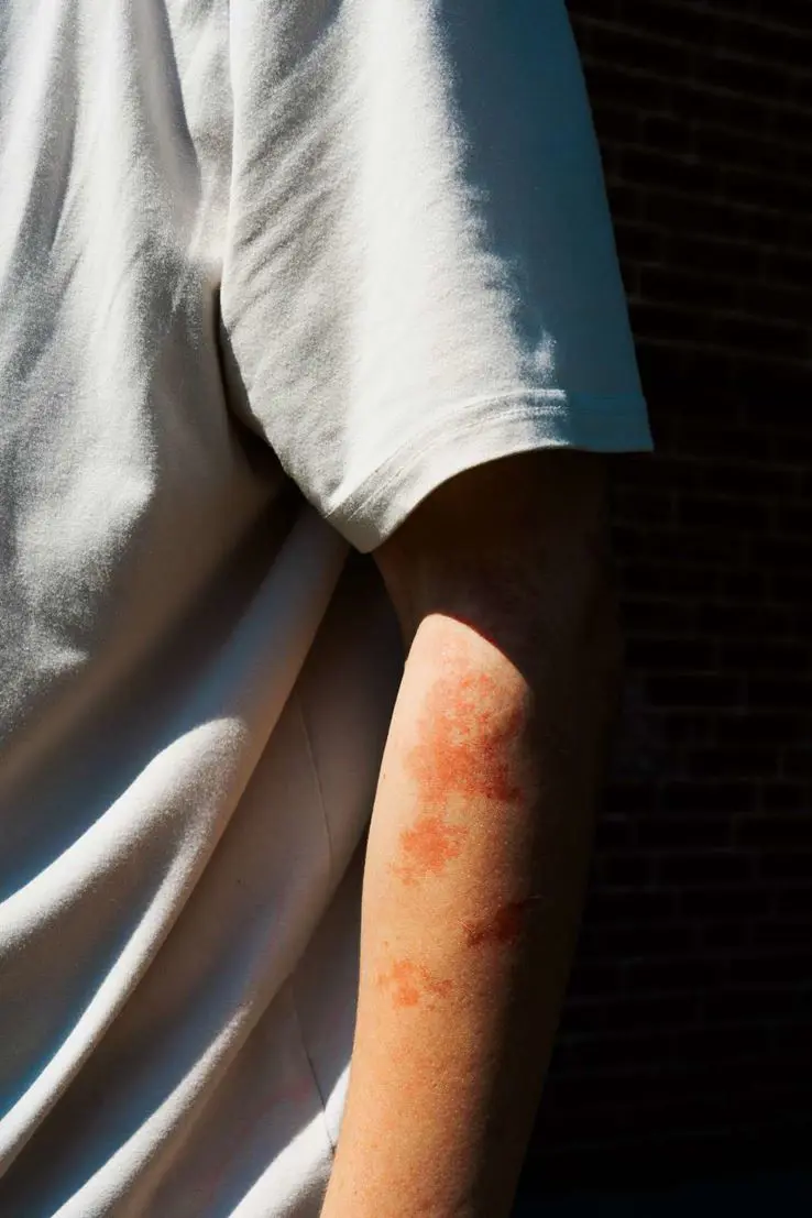 Han trækker sit venstre bluseærme op, så de mange modermærkelignende, røde plamager, der er drysset ud over hans arm, kommer til syne. Et syn, han det meste af sit liv har skammet sig over.