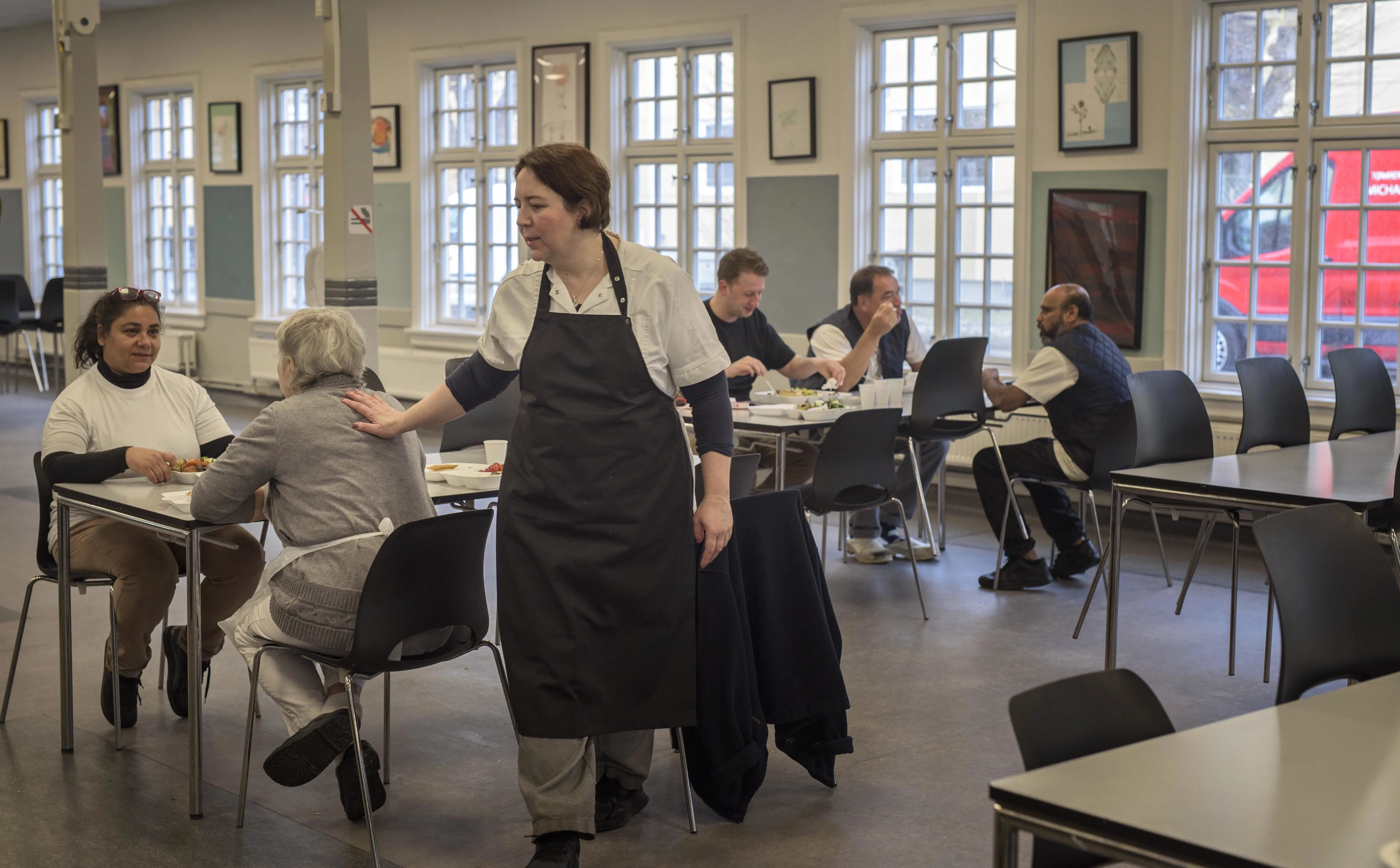 Det problem har den 53-årige tjetjener Anjela Idrissova ikke. Hun flygtede fra krigen mod Rusland i 2001, og fordi hun taler russisk, er det ofte hende, der for tiden står bag disken i køkkenet og serverer mad for beboerne.