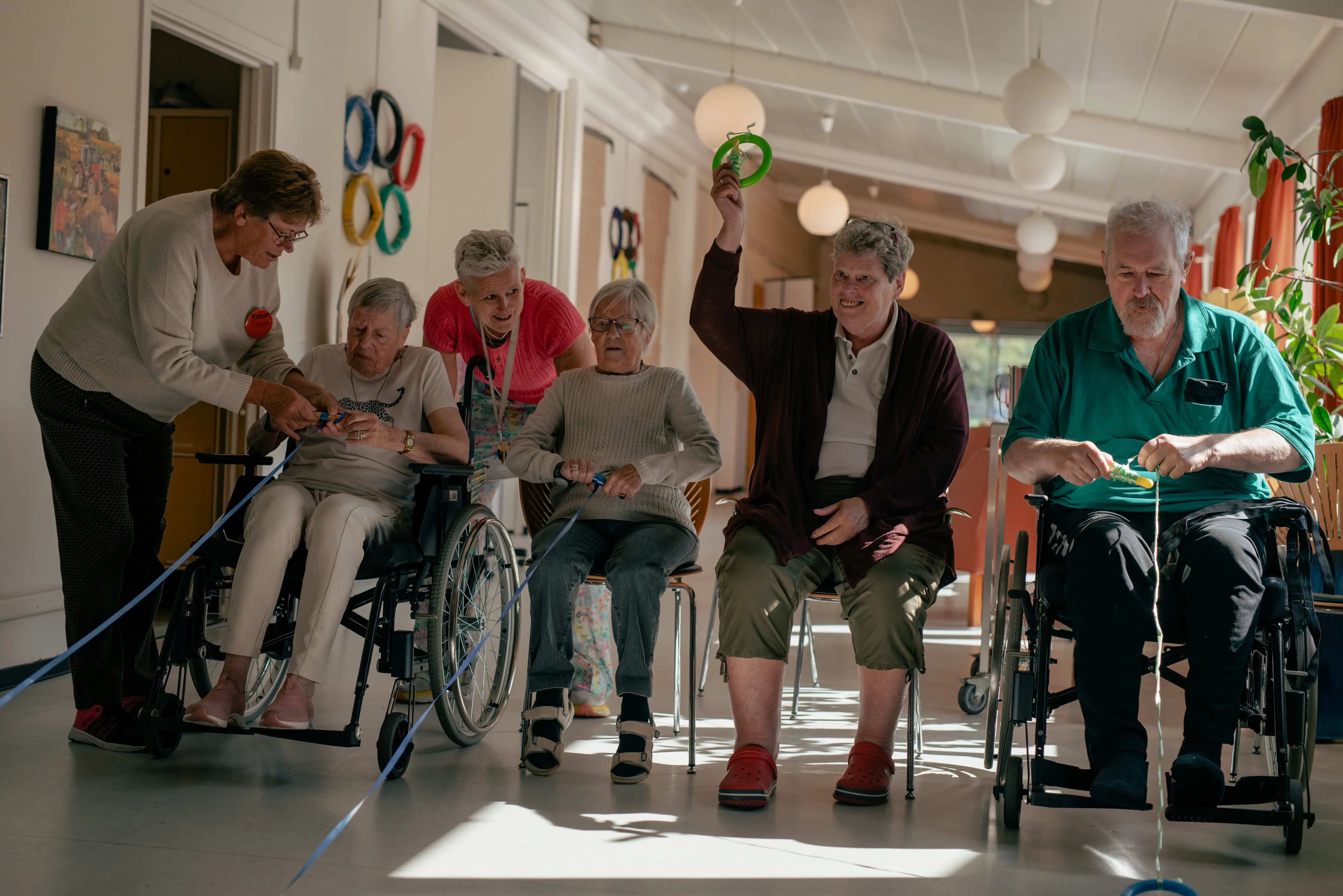 ”Det er ikke alle, der er i stand til at gøre de samme ting. Men alle, der vil, får mulighed for at være med i dag. Og man bliver jo også overrasket af og til. En lidt forsigtig kvinde kan pludselig vise sig at være den absolut bedste til at kaste små sandpuder igennem en plade med udskårne huller i, og det er jo meget hyggeligt,” siger Hans Jørgen Christensen, der har boet på Hundested Plejecenter siden pinsen sammen med sin kone.