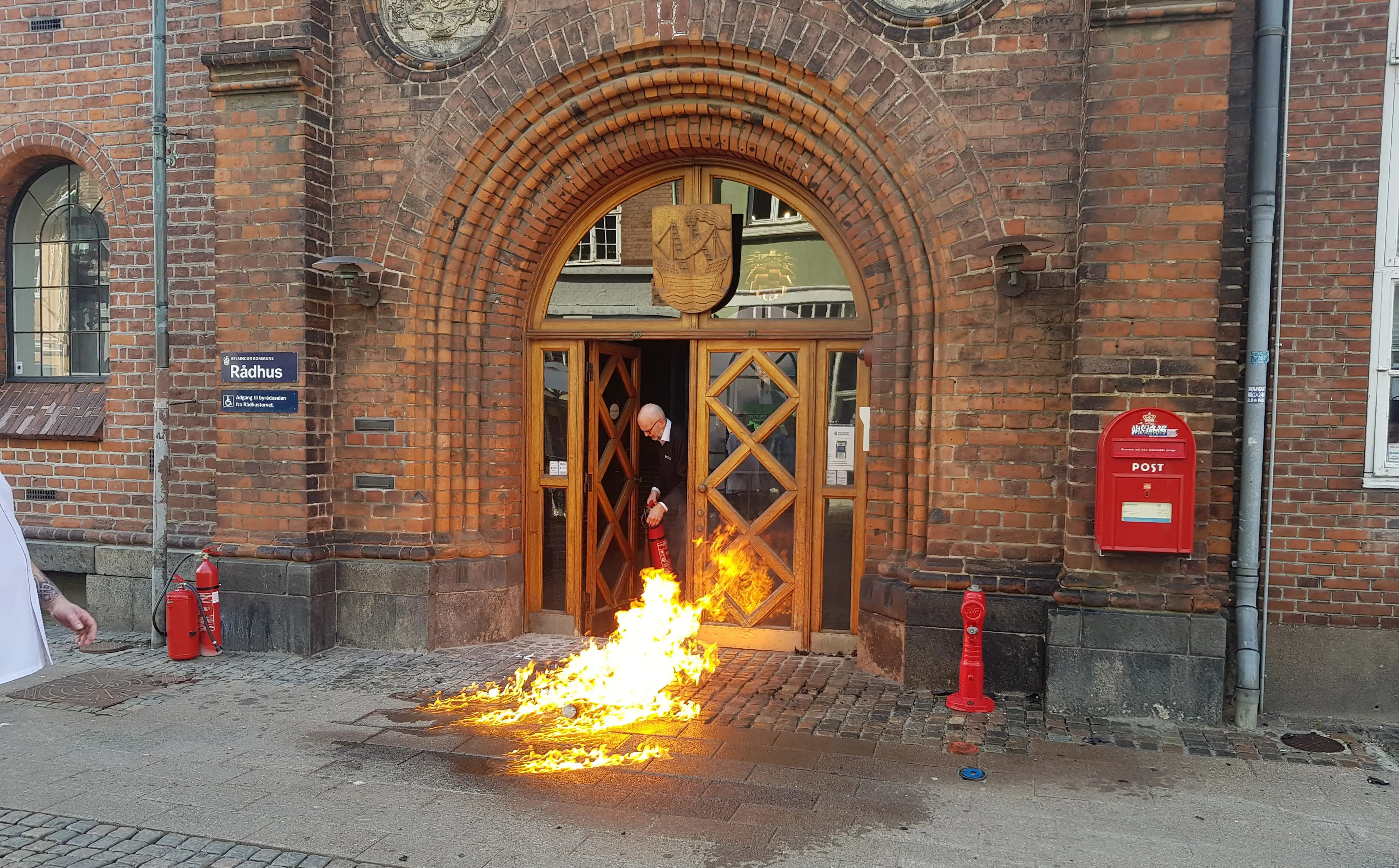 Ude på gaden fik Mikael slukket sportstasken med en pulverslukker, og hurtigt efter dukkede brandvæsenet op for at hjælpe. Efterfølgende har Mikael og kollegerne set overvågningen fra rådhuset, og her viser det sig, at det har været det rene held, at Mikael forlod byrådssalen.