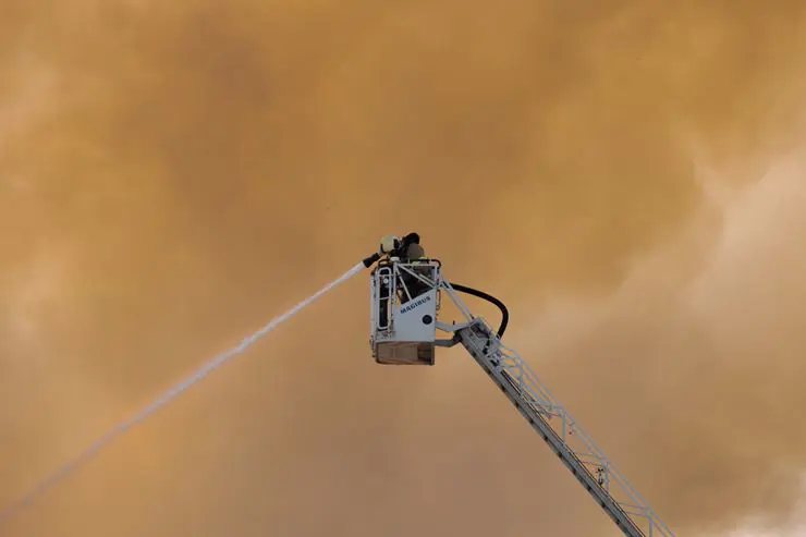 Sammen med de første røgdykkere bevæger Thomas sig op ad en udvendig trappe udenpå stilladset, som sidder på Børsen.