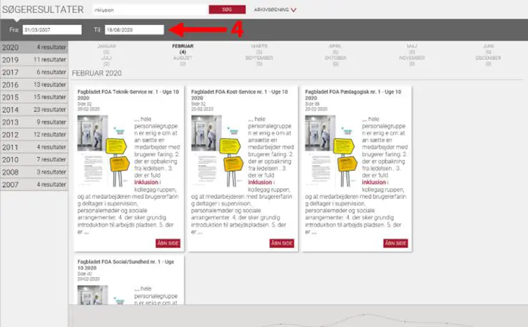 4. I arkivsøgningen kan du indtaste dine søgeord i den øverste boks. For at afgrænse søgningen kan du vælge en specifik "fra"- og "til"-dato.