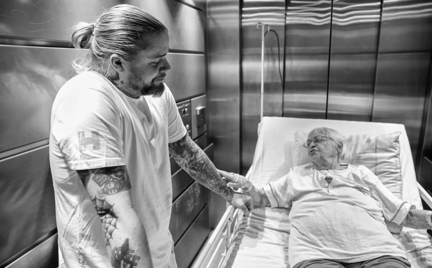 En portør kører et lille barn til opvågning efter en operation. Det er en alvorlig og sårbar situation. Der er meget på spil.